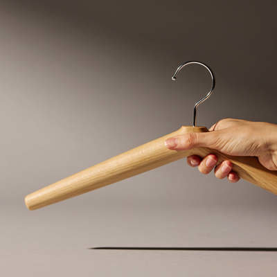 "This hanger, characterized by its straight lines that slope down to both edges, was achieved through repeated testing and adjustment of the appropriate hanger angle, as well as the thickness and curvature of the wood. We sought an angle that would gently hold clothes without them slipping off, without causing damage due to angularity.